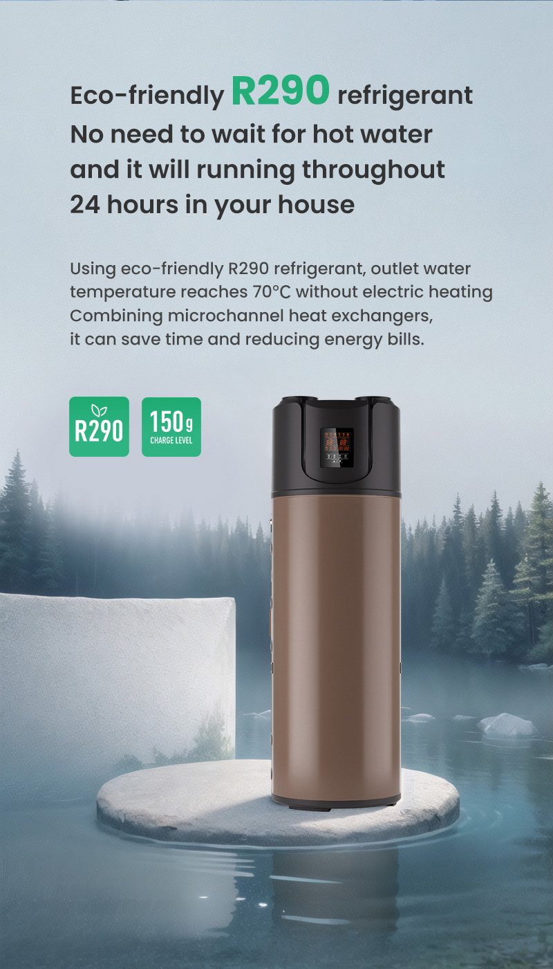 The R290 Heat Pump can achieve water temperatures up to 70°C without the need for additional electric heating elements. This capability ensures that you get hot water efficiently and economically, even in colder climates.